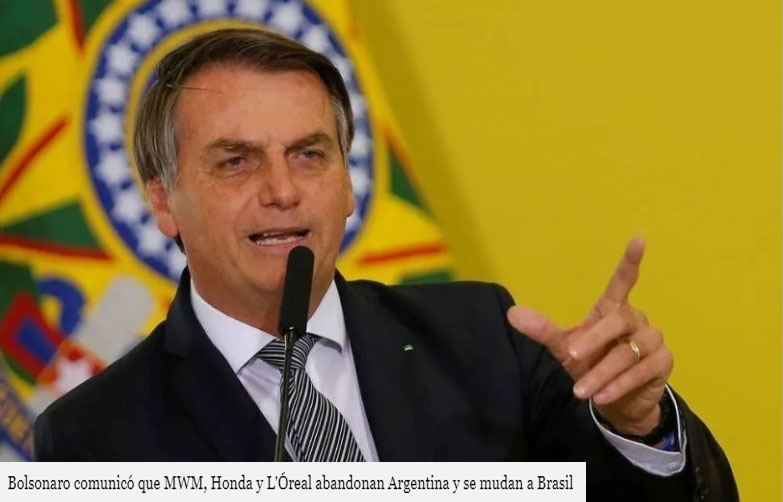 El presidente de Brasil, Jair Bolsonaro, anunció esta mañana que las marcas MWM, Honda y L'Óreal cerrarán sus fábricas en Argentina y se mudarán a Brasil, según escribió esta mañana en la cuenta de la red social Twitter.
