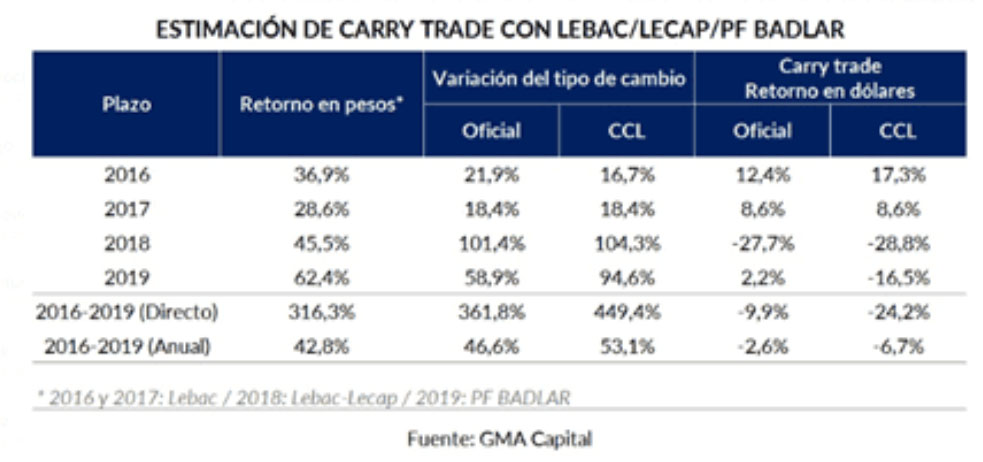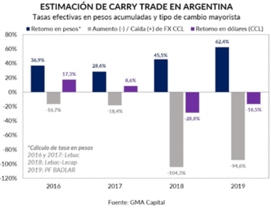 Como balance de los últimos cuatro años, hacer estrategias de carry trade, dieron pérdidas significativas. Aquel que apostó al peso, comprando títulos en moneda local para aprovechar la tasa, terminó perdiendo en dólares. Analistas consideran que actualmente hay pocos incentivos para apostar a estrategias de carry trade a la vez que esperan un salto del dólar bolsa hasta niveles de $80 para recién empezar a pensar en hacer tasa en moneda local. Las proyecciones para estrategias en pesos para 2020 son negativas y con poco interés por parte de inversores